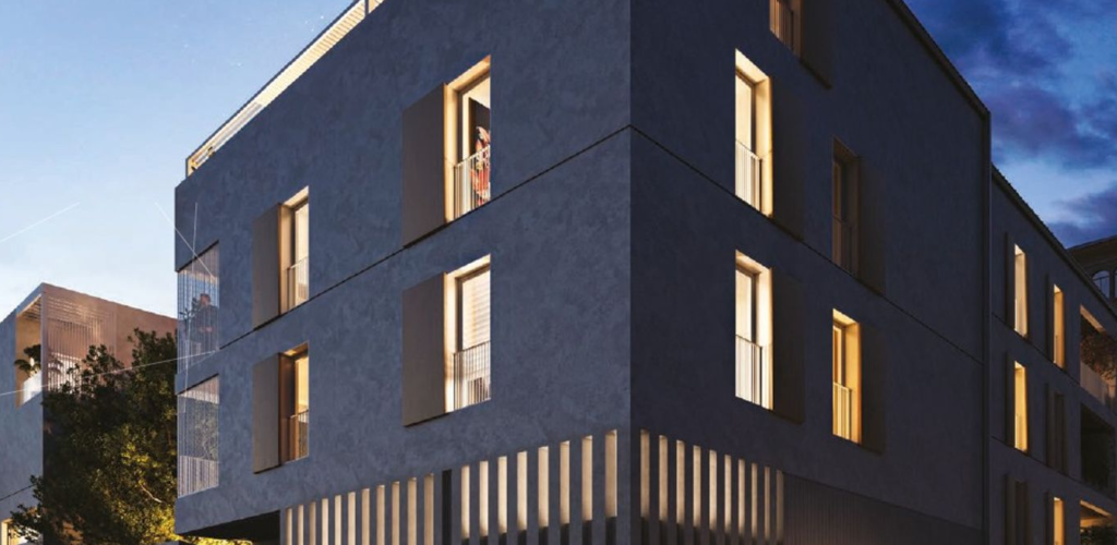 Elles abritent derrière leurs deux, trois ou quatre étages, les 62 appartements du 2 au 4 pièces en duplex et les trois maisons individuelles de la résidence.                Pour répondre au principe d’intégration et de composition des façades avoisinantes, le côté de la rue Montévidéo a été réservé à la construction des maisons de ville. Moins hautes, elles permettent une percée visuelle sur le jardin où la lumière entrante apporte à la résidence tout son éclat provençal. Organisées en triplex, elles possèdent des loggias équipées de brise-soleil donnant sur un jardin privatif d’hiver en pleine terre, offrant ainsi à leur séjour contigu un décor naturel exclusif. Leur hall d’entrée traversant donne à voir le cœur végétalisé de la résidence.
